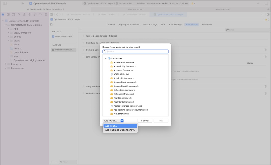 3. And click on + to add framework, it pops up a dialogue where you need to select Add Other.. from the dropdown. Now from the options you select Add Files..